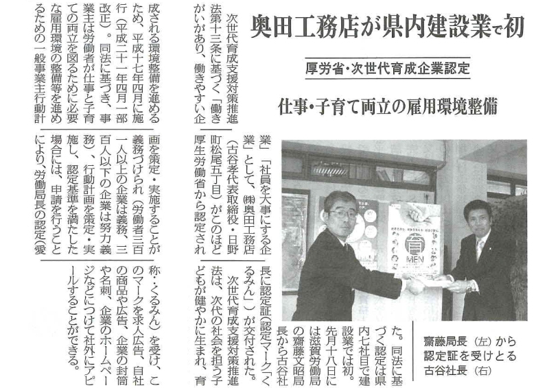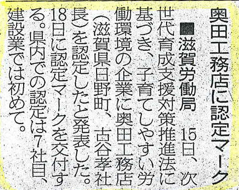 厚生労働省より次世代育成企業に認定されたとして、