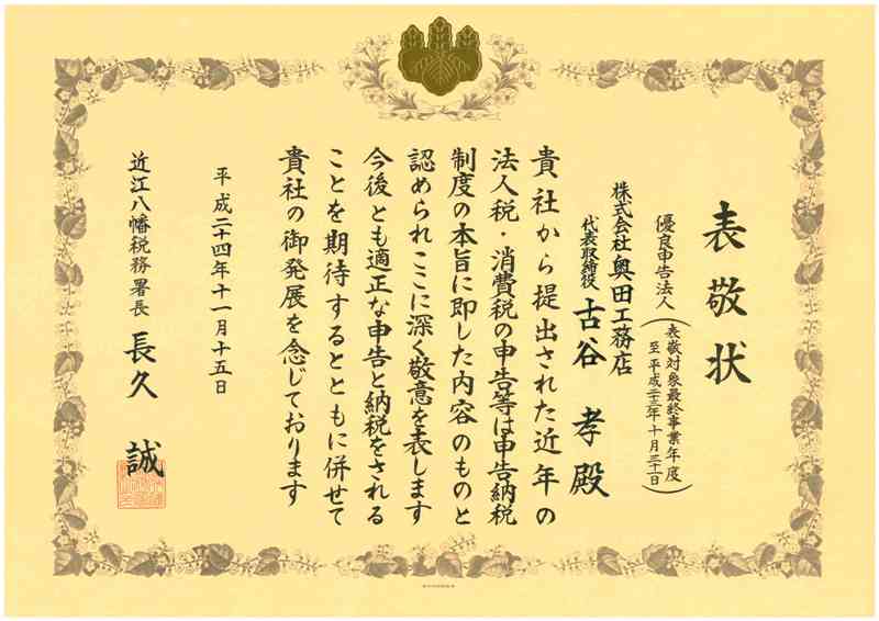 株式会社奥田工務店は【平成24年度優良申告法人】にご指定頂き、平成24年11月15日近江八幡税務署長をはじめ統括国税調査官が当社を表敬訪問されました。優良申告法人とは、税務調査等による企業の経営内容の分析結果を踏まえ、法人税の申告制度の本旨に沿い安定した業績と透明性ある企業姿勢を認められた法人に対し管轄税務署より認定される制度です。